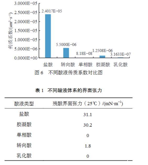以鹽酸、膠凝酸、轉向酸和乳化酸為對比,測定不同酸液體係傳質係數,實驗結果見圖6。單相酸體係緩速效果最強,比乳化酸體係還下降了一個數量級,緩速率為99.6%,可以達到緩速深部酸化的效果。單相酸相比於乳化酸酸岩反應速度明顯下降,這與乳化酸粒徑研究結論也是相似的:粒徑越小,酸岩反應速度越慢。