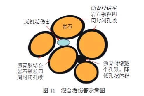 通過觀察傷害後岩心表麵,可以發現瀝青在孔隙係統中的分布模式如圖11所示。對於孔隙係統來說,瀝青膠結在岩石顆粒四周,這類瀝青可能對減小孔隙體積作用不明顯,但其可以顯著限製或封閉孔喉,導致滲透率下降;另一種充填在孔隙內,堵塞整個孔隙,降低孔隙體積。儲層中的瀝青占據儲層的部分儲集空間,破壞儲層孔隙結構,不僅會減小儲層的孔隙度,同時還會大幅度減低儲層滲透率,嚴重影響儲層物性及油氣井產能。