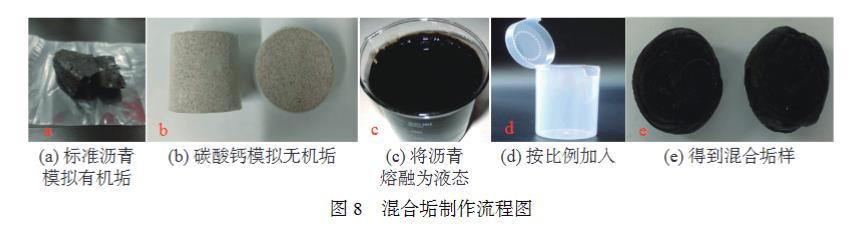 采用瀝青塊模擬有機垢,碳酸鈣(灰岩)模擬無機垢,瀝青和碳酸鈣3∶7混合物模擬混合垢。混合垢樣製作步驟如下:①將瀝青塊敲成小塊放入燒杯;②控溫磁力攪拌器將瀝青融化為液態;③將液態瀝青趁熱導入塑料試管中;④再按比例加入碳酸鈣,在瀝青凝固前攪拌均勻;⑤得到比表麵積接近混合垢(瀝青碳酸鈣質量比為3∶7),混合垢製作流程圖見圖8。