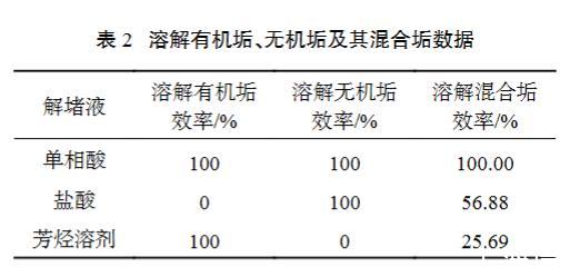 1.針對近井地帶存在的有機、無機及其混合垢傷害,開發了一種新型多功能解堵體係-單相酸體係。該單相酸體係由芳烴溶劑、酸液、表麵活性劑、助表麵活性劑及功能型添加劑組成。
