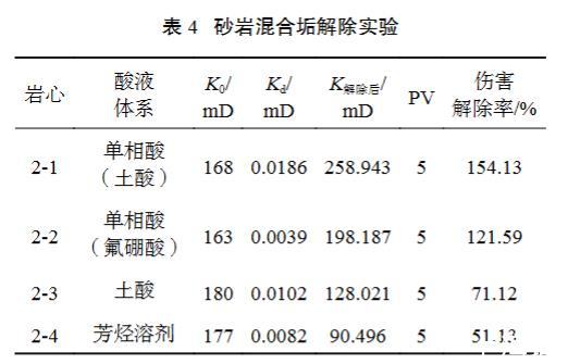3.單相酸解堵後,岩心滲透率恢複率大於100%,表明單相酸體係不僅可以解除有機垢和無機垢傷害,還能酸蝕增滲,改善近井區域岩石滲流特性。