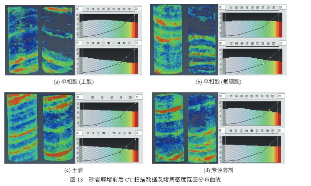 對混合垢傷害解堵前後的岩心進行CT掃描,見圖13。對CT掃描圖像數據密度分布進行處理,紅色區域為以無機質為主的高密度堵塞區域,藍色範圍為有機質為主的低密度堵塞區域,圖中可見單相酸(土酸)傷害解除範圍最大,對高密度的礦物溶蝕性能更好。土酸、芳烴溶劑單獨處理效果差。也可從堵塞物CT密度分布曲線得出相同結論(其中,密度分布曲線中橫坐標代表密度數,按照空氣為0,水為1000進行校正;縱坐標為歸一化密度累計占比,對應曲線為混合垢傷害前岩石密度分布,作為參照。密度分布曲線中彩色區域代表不同密度下CT響應強度),土酸解除了高密度範圍的堵塞,但低密度堵塞沒有解除;芳烴溶劑解除了低密度範圍堵塞,但高密度堵塞沒有解除,而單相酸體係均有解除。
