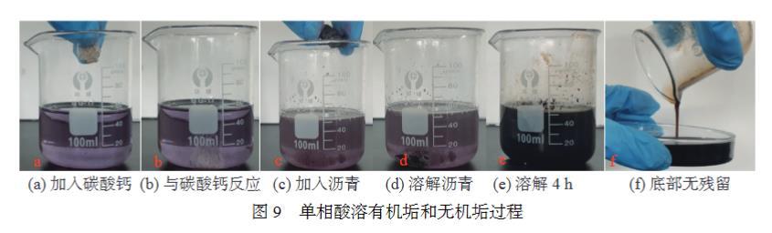 分別對鹽酸、芳烴溶劑、單相酸溶解有機垢、無機垢及其混合垢性能進行測試。實驗條件:90℃水浴,50 g溶液,2.5 g垢樣,溶解4 h,實驗結果見表2。從表2可以看出,單相酸對混合垢溶解效率遠高於單一解堵體係,具備同時解除有機垢、無機垢及其混合垢的能力。單相酸溶有機垢和無機垢過程圖片見圖9,當碳酸鈣加入後,單相酸與碳酸鈣反應較明顯;當瀝青加入後,常溫下溶解較慢,90℃水浴4 h後完全溶解;溶解後的殘液倒出後,燒杯底部無殘留,表明單相酸可以完全溶解有機垢(碳酸鈣)和無機垢(瀝青)。