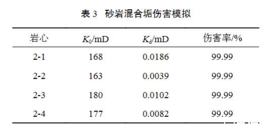 在該實驗方案下,交替注入的碳酸鈉溶液與氯化鈣溶液會在孔隙中形成白色的碳酸鈣沉澱,瀝青飽和進入孔隙中經過正庚烷的揮發瀝青黏度急劇增加,封堵孔隙造成滲透率下降,可以模擬混合垢傷害砂岩儲層。由表3可見,獲得的砂岩混合垢傷害率大於99%,傷害後岩心滲透率小於0.02 mD,傷害顯著。