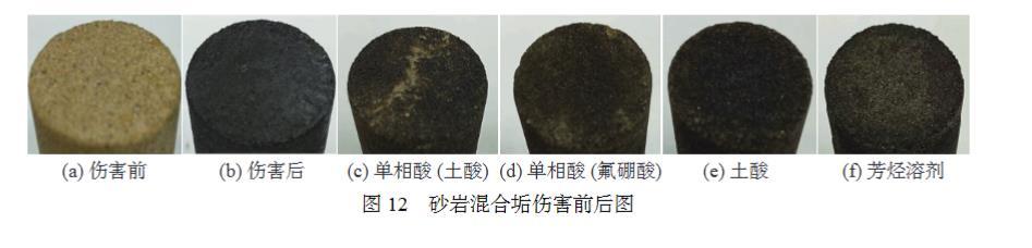 實驗模擬改變單相酸的酸相(土酸、氟硼酸)與土酸和芳烴溶劑進行對比實驗,實驗結果見表4。岩心傷害前後及采用不同體係解堵後的岩心端麵照片見圖12。實驗結果顯示芳烴溶劑和土酸隻能部分解除砂岩岩心傷害,單相酸體係不僅可以解除有機垢和無機垢傷害,還能酸蝕增滲,使得傷害解除後岩心滲透率高於傷害前岩心滲透率。