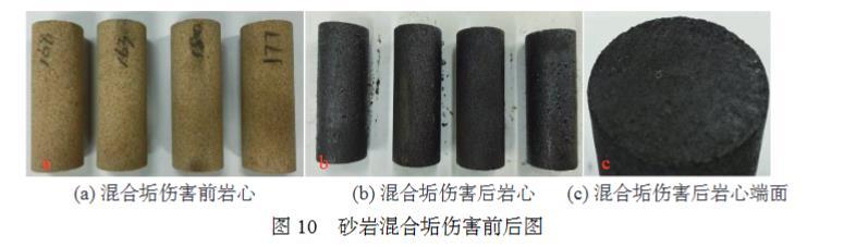 為在室內模擬混合垢岩心傷害,設計如下實驗步驟:①氣測岩心初始滲透率;②模擬無機垢傷害:使用10.5%碳酸鈉溶液與15%氯化鈣溶液交替注入,模擬無機垢(CaCO3)的損害;③模擬有機垢傷害:50%的瀝青正庚烷溶液與二甲苯1∶1混合,抽真空進行岩心飽和,傷害72 h後烘幹;④傷害後岩心氣測滲透率;⑤計算傷害率。混合垢傷害前後砂岩岩心圖片見圖10。