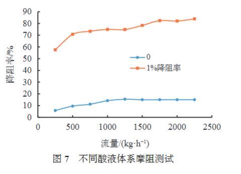 采用摩阻測試儀測定單相酸的降阻率,實驗結果可以看出,在不加減阻劑的情況下,單相酸與水的摩阻相當,表明不加減阻劑情況下,單相酸不具備減阻效果;加入0.1%減阻劑後,可明顯降低單相酸摩阻,降阻率可達80%以上,摩阻和膠凝酸相當,遠低於乳化酸摩阻。