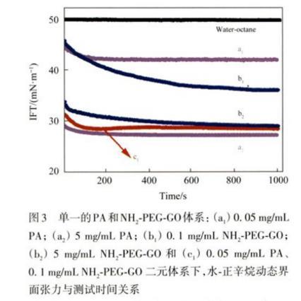 當低質量濃度的NH2-PEG-GO與PA共存時,相比於單組分NH2-PEG-GO(0.1 mg/mL)或PA(0.05 mg/mL)能更有效降低界麵張力。例如,油相水相分別添加低質量濃度的PA(0.05 mg/mL)與NH2-PEG-GO(0.1 mg/mL),即可實現與單獨添加高質量濃度PA(5 mg/mL)或NH2-PEG-GO(5 mg/mL)相同的效果。並且此時界麵張力隨時間變化曲線與單獨添加PA類似,平衡時間在200 s左右。這表明前期的界麵張力降低現象主要由PA吸附引起。