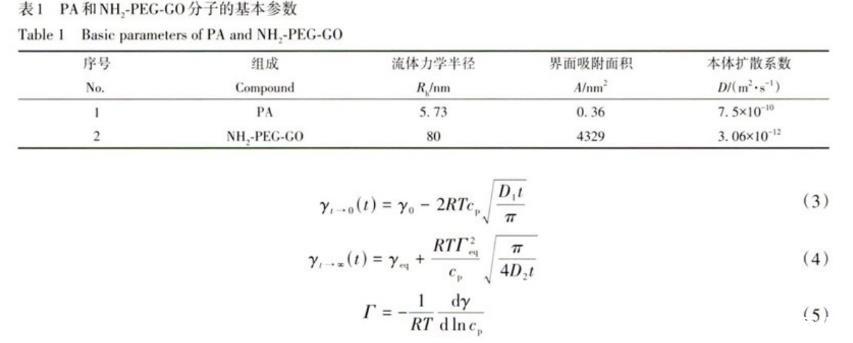 這些吸附解析特征由NH2-PEG-GO和PA的尺寸差異引起。NH2-PEG-GO納米片尺寸相比於PA較大,其在水溶液中擴散係數D=3.06×10-12 m2/s比PA分子在正辛烷中的擴散係數小2個數量級(表1和輔助材料圖S1、圖S2)。因此,PA分子擴散到界麵速率快,會優先吸附到界麵上,PA分子的親水羧基會靠近水相,疏水烷基鏈伸向油相。而當NH2-PEG-GO分子貼近水-油界麵時,其親水長鏈PEG-NH2會先接觸界麵,然後疏水平麵逐漸平行於界麵,最終使疏水基麵與界麵接觸。這種界麵取向為GO在界麵的最小自由能狀態,能夠大麵積地覆蓋水-油界麵。