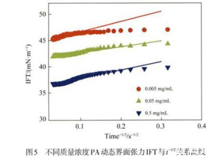圖5不同質量濃度PA動態界麵張力IFT與t-1/2關係曲線