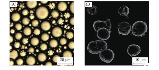 以DA-GQD為顆粒乳化劑、L-薄荷醇(熱熔)為油相製備的Pickering乳液的光學顯微鏡照片(OM)如圖5(A)所示。從圖5(A)可以看出,Pickering乳滴粒徑約為10μm,具有規則統一的球形形貌。由於DA-GQD具有較高的親水性,因此傾向於形成穩定的水包油型乳液。DA-GQD固體顆粒分散在薄荷醇/水界麵,這是因為液-液界麵的一部分被液-顆粒界麵代替時總界麵能降低,L-薄荷醇被微小的石墨烯片覆蓋,位於液滴的中心。