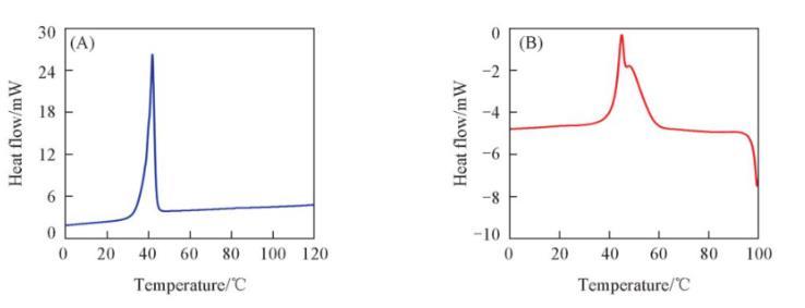 圖6(A)和(B)分別為空白樣品與負載型樣品的示差掃描量熱(DSC)曲線。從圖6(A)可以看出,L-薄荷醇樣品在大約42℃左右出現一個尖銳的吸熱峰,對應於L-薄荷醇的熔點。而負載型樣品則出現了兩個吸熱峰[圖6(B)],其中第一個峰主要是由生長在DA-GQD外表麵的薄荷醇小晶體融化引起的,而第二個峰主要是由DA-GQD包覆的薄荷醇小晶體融化引起的。這與劉紹華等的研究結果相類似。