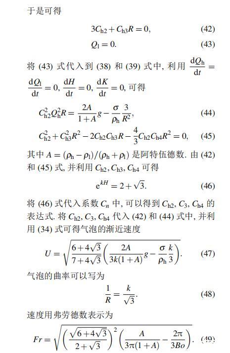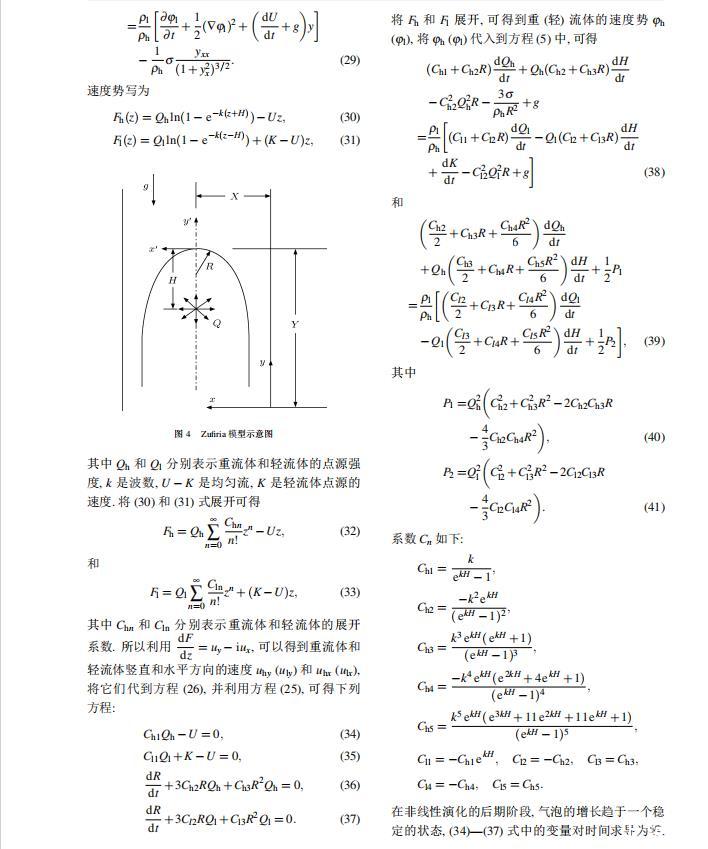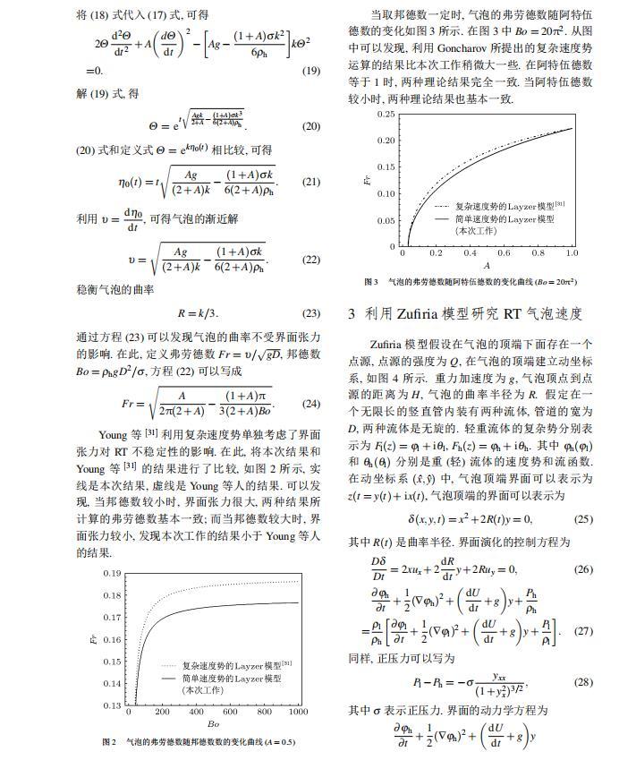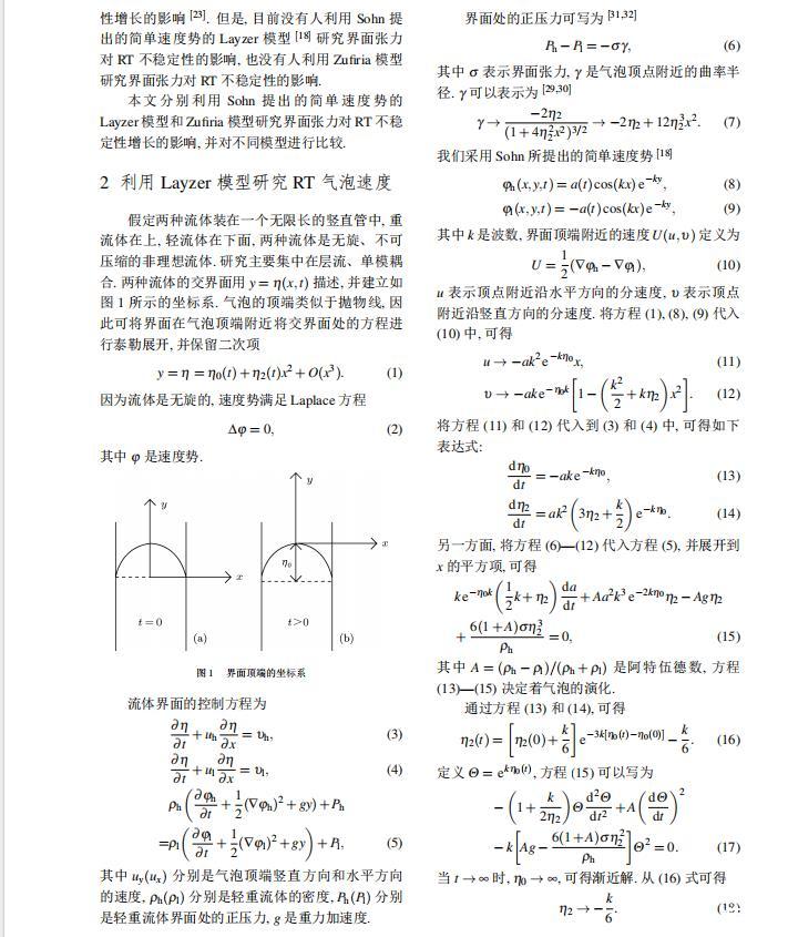 Layzer模型和Zufiria模型都是建立在理想流體之上。然而對實際流體而言,很多因素都可以影響RT不穩定性的演化情況,如密度比、黏性、界麵張力、壓縮性、外場加速度、Kelvin-Helmholtz不穩定性等。Young和Sohn利用Goncharov提出的複雜速度勢,將Layzer模型推廣並應用到非理想流體中,研究了界麵張力對RT不穩定性增長的影響,發現界麵張力降低了氣泡的增長速率。2011年本文的作者之一利用Zufiria模型研究了黏性對RT不穩定性增長的影響。但是,目前沒有人利用Sohn提出的簡單速度勢的Layzer模型研究界麵張力對RT不穩定性的影響,也沒有人利用Zufiria模型研究界麵張力對RT不穩定性的影響。