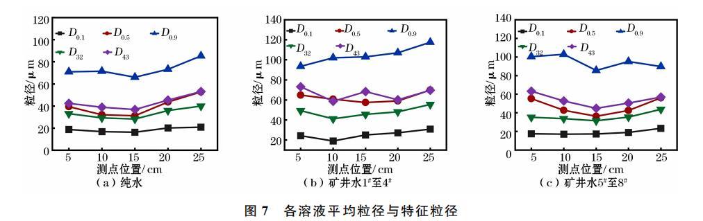 礦井水1#至8#在15cm處的平均粒徑和特征粒徑逐漸增大,這說明表麵張力對噴霧平均粒徑和特征粒徑具有直接影響。礦井水1至4#各平均粒徑和特征粒徑之間差異明顯,而其餘溶液差異較小,這表明純水和礦井水5#至8#的噴霧粒徑分布優於礦井水1至4,霧場中霧滴更趨向均一化分布,易於捕集沉降粉塵。綜上,礦井水中Na+、K+離子濃度對其表麵張力及噴霧液滴粒徑變化趨勢至關重要,對於霧場中噴霧粒徑的均一性和各平均粒徑和特征粒徑的差異性也有重要影響。