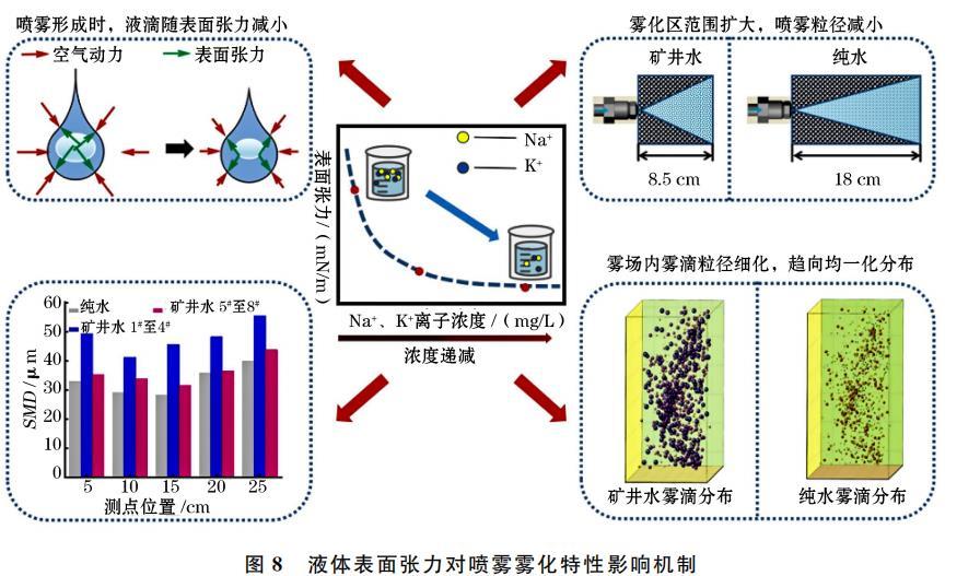 結合試驗結果,得到礦井水Na+、K+濃度對噴霧霧化特性的影響機製如圖8所示。溶液中Na+、K+等離子濃度通過改變其表麵張力,間接影響噴霧霧場性能。當溶液中Na+、K+等離子濃度減小,氣-水界麵對離子排斥作用減弱,導致溶液表麵張力減小。
