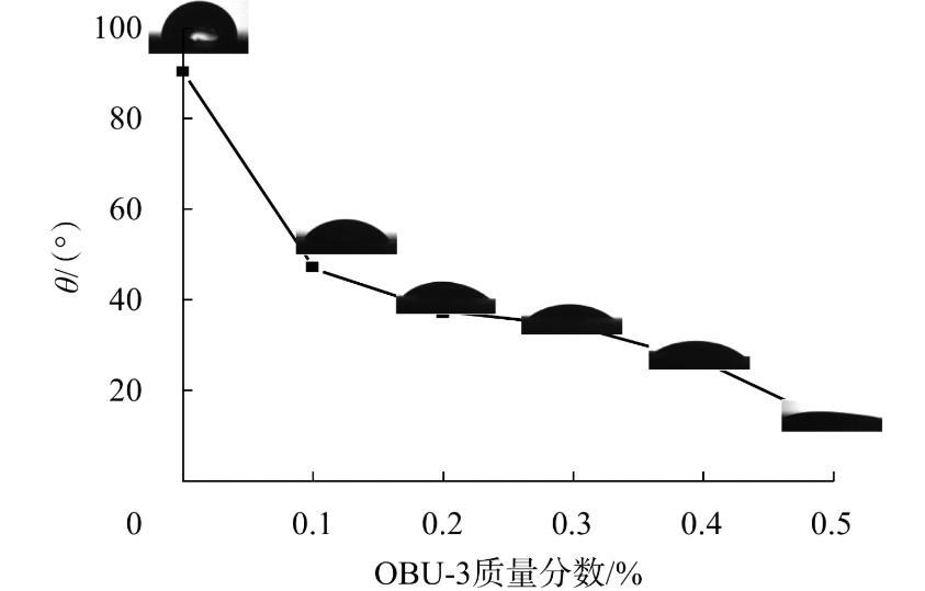 圖5 OBU-3質量分數對原油處理岩石薄片後接觸角的影響