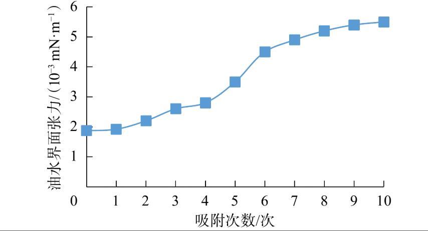 圖4為使用岩心粉對質量分數為0.5%的OBU-3溶液重複進行10次吸附實驗後的油水界麵張力情況。從圖4可看出:隨著吸附次數的增加,油水界麵張力增加;經過10次吸附後,油水界麵張力仍在超低界麵張力範圍內。這說明OBU-3低黏表麵活性劑體係在岩心上吸附較少,吸附多次後,在油水界麵上仍足以使界麵張力處於超低值,滿足驅油對表麵活性劑的要求。