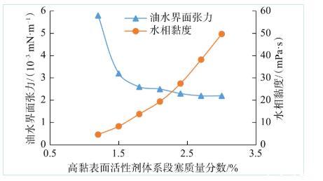 圖2 ACS-2高黏表麵活性劑體係含量對界麵張力和水相黏度的影響