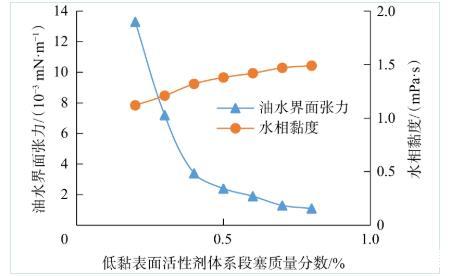圖1 OBU-3低黏表麵活性劑體係含量對界麵張力和水相黏度的影響