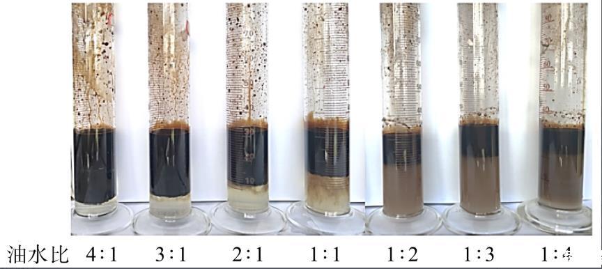 圖3為在45℃放置24 h後不同油水體積比條件下OBU-3低黏表麵活性劑體係對油水的乳化情況。從圖3可看出,部分乳液分層嚴重,破乳效果較好。OBU-3對油水的乳化程度隨著油水體積比的增加而減小,油水體積比為4∶1、3∶1、2∶1、1∶1時分離出的水顏色較淺,油水分離效果較好。