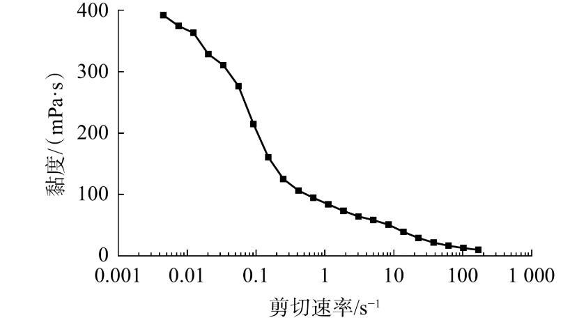 圖7為小段塞的黏度隨剪切速率的變化情況。從圖7可看出,體係黏度隨剪切速率的增加而快速降低,從392.8 mPa·s降至10.3 mPa·s。由於剪切力作用下纏結的自組裝超分子鏈打開並發生取向,導致表麵活性劑的黏度整體上隨著剪切速率的上升而下降。在低剪切頻率下黏度下降明顯,屬於典型的“非牛頓流體”,但當剪切速率進一步增大時,黏度下降緩慢。