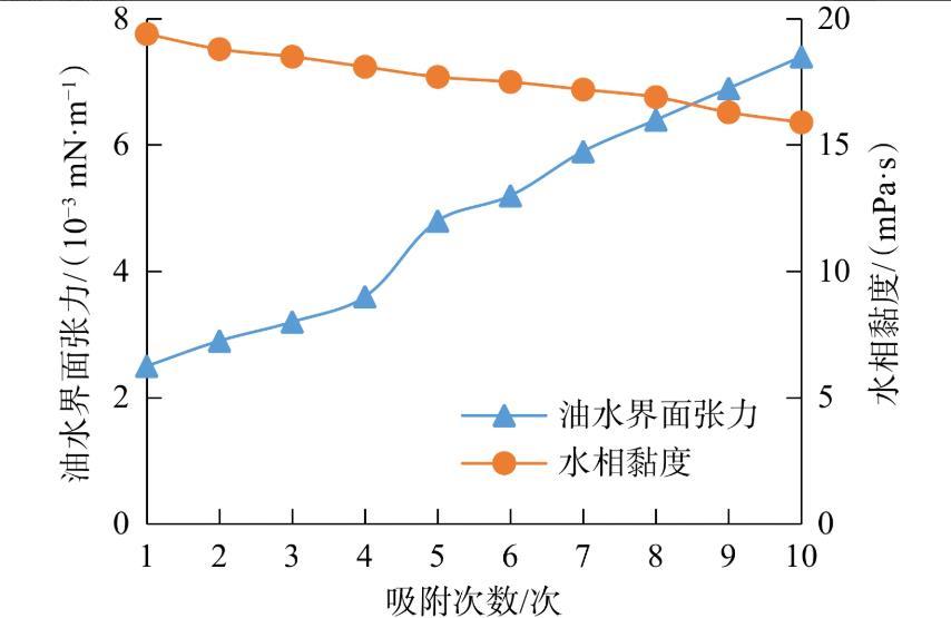 圖6吸附次數對ACS-2高黏表麵活性劑體係的界麵張力和水相黏度的影響
