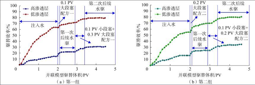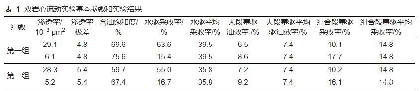 從表1可知,通過並聯天然岩心表麵活性劑驅油實驗發現,隻用大段塞驅平均提高采收率7.4個百分點,非常低。而采用組合段塞進行調和驅,第一組組合段塞驅在高低滲層分別提高驅油效率10.1個百分點和17.7個百分點。第二組組合段塞驅在高低滲層分別提高原油采收率10.2個百分點和16.1個百分點,兩組組合段塞驅平均提高采收率為14.8個百分點,比隻用大段塞驅平均采收率提高了1倍,達到了聚/表二驅的驅油效果。