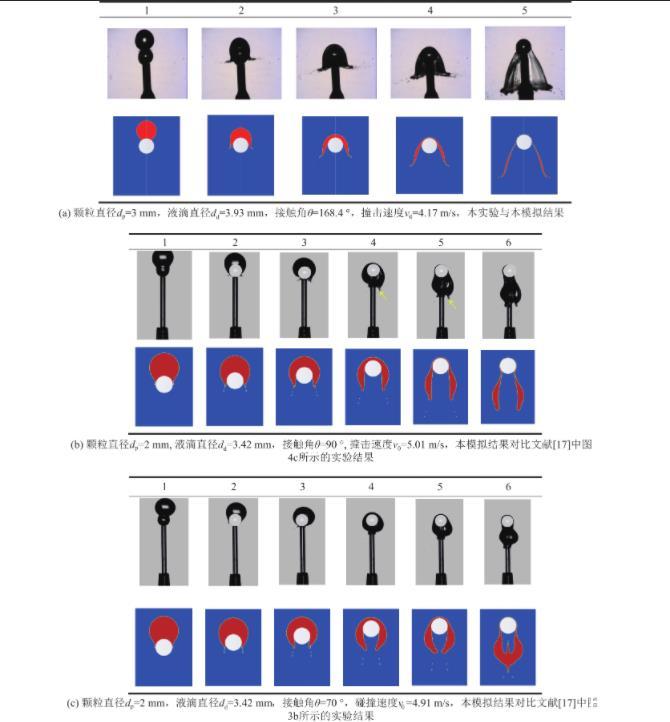 為進一步驗證本模型計算結果的可靠性,依據BANITABAEI等在實驗中設置的不同碰撞條件,開展了相應的數值模擬。如圖5b和圖5c所示,在不同碰撞條件下,數值模擬結果中的液滴形變過程與實驗結果均具有較高的吻合度。圖6對比了數值模擬結果與實驗結果中液滴幾何尺寸的變化過程,也具有較高的吻合度。其中,圖6a所展示的液膜底部直徑隨時間變化曲線,數值模擬結果與實驗結果稍有偏差,原因是實驗中固定顆粒的支撐柱對液膜底部的形變過程產生了一定影響。綜上所述,可認為筆者構建的數值模擬模型合理,結果具有較高可靠性。由於在毫米尺度下和微米尺度下,液滴與固體顆粒的碰撞過程均遵守經典牛頓力學定律和經典流體力學理論,所以本數值模擬模型可用於微米尺度下的其他工況條件的數值模擬研究。