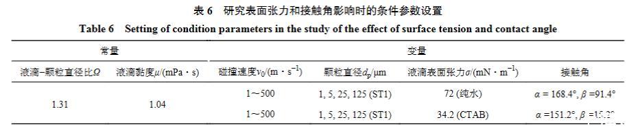 為了進一步確定液滴潤濕特性對液體附著比例的影響,筆者以碰撞速度、顆粒直徑和液滴表麵張力(72 mN/m,34.2 mN/m)3個參數為自變量設置了不同的數值模擬條件,具體取值見表6。