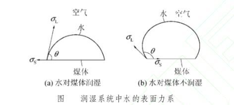 式中,θ為水與煤表麵的接觸角,它是指在固、液、氣三相交界處,自固-液界麵經液體內部而到液-氣界麵的夾角。如果接觸角θ<90°屬可濕潤煤體,在相同的水表麵張力係數條件下,θ角愈小,毛細作用力則愈大,增強了注水動力,潤濕能力愈大;若濕潤邊角θ>90°屬於不可濕潤煤體,θ角愈大,潤濕能力愈小。