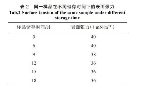在溫度為23℃、相對濕度為60%的環境下,測試樣品在不同儲存時間下的表麵張力,測得數據見表2。由表2可知,樣品轉移塗層剛開始成膜時的表麵張力為40 mN/m,且樣品儲存6個月以內的表麵張力基本保持不變。7—9個月出現衰退,降低為38 mN/m,符合真空噴鋁紙行業標準(BB/T 0054—2010)。儲存12個月至18個月的紙樣表麵張力僅為36 mN/m,但並未在儲存18個月時出現進一步的明顯降低。顯然,紙樣的表麵張力緩慢降低並不能解釋2.1節中出現的18個月印刷油墨與轉移塗層的附著力差的問題。再根據相關研究,表麵張力≥38 mN/m的要求,並不直接適用於轉移紙印刷的質量控製,特別是用於UV膠印的真空噴鋁轉移紙的轉移塗層。膠印印刷適應性並不完全由表麵張力所決定。