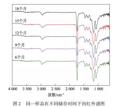 為了探究表麵轉移塗層是否發生了結構變化,對不同儲存時間下的樣品進行紅外光譜測試分析,見圖2。可以看出,儲存時間為6—18個月的樣品的紅外譜圖並未發生明顯變化。譜圖的一致性證明了噴鋁紙表麵轉移塗層的基本結構並未隨著時間發生明顯變化,即掉墨現象的出現並非由於轉移塗層出現結構變化導致。根據相關研究,噴鋁紙在儲存的時候,紙張及塗層中添加的助劑,環境介質中的水分子、油汙和空氣等小分子物質會通過吸附、擴散、遷移和凝集等作用,甚至鍵合等途徑,在轉移塗層表麵形成低分子物質的富集區,即弱界麵層,降低了轉移塗層的表麵張力,並使其印刷適性變差。