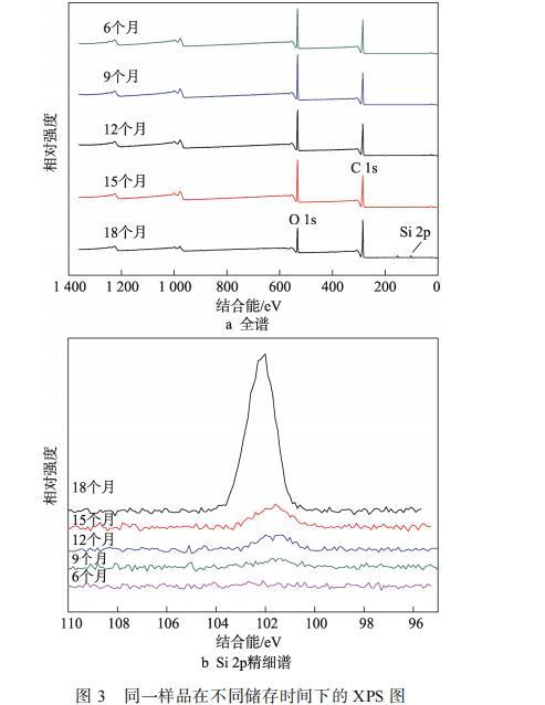 為了探究噴鋁紙表麵析出的小分子物質的成分,筆者通過XPS分析儲存時間為6個月、9個月、12個月、15個月、18個月紙張表麵元素的變化,見圖3a。在XPS光譜圖中,可以觀察到C 1s,O 1s的特征峰,結合能分別為285.1、532.3 eV。第18個月紙張的XPS光譜圖中,出現了Si 2p的特征峰,結合能為102 eV。由圖3b和表4可知,6—15個月矽含量逐漸增加,元素原子數分數由0增至0.6%,但均未出現成型的峰。18個月的紙張表麵矽原子數分數劇增為3.5%。這表明隨著儲存時間增加,紙張表麵逐漸有含矽的無機小分子析出。此外,由表4也可看出,18個月的樣品表麵C原子數分數明顯升高,從69.9%升至75.1%,O原子數分數則由29.5%降低至20.0%,證明矽主要以Si−C鍵的形式存在,析出的有機矽形成了低分子物質弱界麵層,降低了樣品塗層的表麵張力。