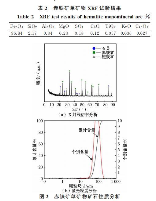 赤鐵礦單礦物則取自某鐵礦廠,將製備後的赤鐵礦樣品進行X射線衍射(XRD)分析、X射線熒光光譜(XRF)分析和激光粒度分析,XRD的分析結果如圖2(a)所示,XRF的分析結果見表2,粒度分析如圖2(b)所示。從圖2(a)和表2可以看出,Fe₂O₃峰強度最高,含量達到了96.84%,另外含有少量的氧化物SiO₂、Al₂O₃等。從圖2(b)可以看出,樣品的中值粒徑D₅₀達到了79.89μm,D₉₀則達到了123.2μm.綜合上述純度以及粒度,赤鐵礦可滿足後續單礦物試驗的要求。
