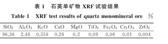 本試驗所用的單礦物石英取自某礦廠,將製備後的石英單礦物樣品進行X射線衍射(XRD)分析、X射線熒光光譜(XRF)分析和激光粒度分析,XRD的分析結果如圖1(a)所示,XRF的分析結果見表1,粒度分析如圖1(b)所示。從圖1(a)可以看出,石英單礦物SiO₂峰強度以及密度最高,說明SiO₂占主導地位。從圖1(b)可以看出,樣品的中值粒徑D₅₀達到了133.5μm,D₉₀則達到了264.3μm.綜合上述礦物的純度以及粒度,石英可滿足後續單礦物試驗以及機理分析的要求。