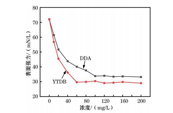 圖6顯示了DDA與YTDB在石英礦漿中的表麵張力。由圖6可知,隨著捕收劑濃度增大,液體的表麵張力均逐漸降低。在DDA捕收體係中,當濃度增加到100 mg/L時,液體的表麵張力開始趨於穩定,再增加DDA濃度,表麵張力變化不大。故DDA體係下,液體的最低表麵張力約為33.79 mN/m,臨界膠束濃度為100 mg/L;在YTDB捕收體係中,當濃度增加到60 mg/L時,液體的表麵張力開始趨於穩定,再增加YTDB濃度,表麵張力變化不大。故YTDB體係下,液體的最低表麵張力約為29.67 mN/m,臨界膠束濃度為60 mg/L.綜上所述,從表麵張力來看,YTDB形成膠束和降低表麵張力能力更強,疏水性更好,捕收能力更強。
