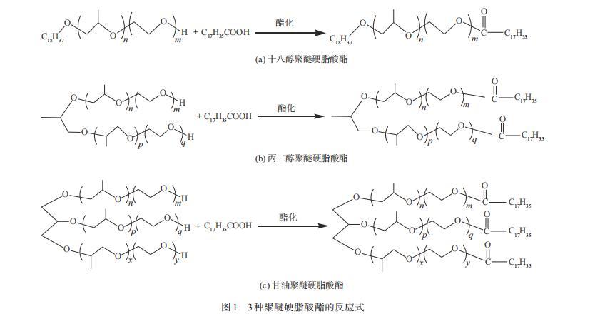 稱取一定質量的聚醚包括不同脂肪醇聚醚、丙二醇聚醚和甘油聚醚,同不同脂肪酸置於500 mL的反應燒瓶內,攪拌,升溫,當溫度上升至80℃時,加入0.2%(相對於體係總質量)的對甲苯磺酸作為催化劑,改變體係狀態為真空,壓力在−0.095 MPa以下。繼續升溫至140℃,保溫4 h,然後降溫至60℃,加入NaHCO₃中和催化劑,繼續攪拌降溫至室溫,得到聚醚脂肪酸酯(以下簡稱聚醚酯)消泡劑。以硬脂酸為例合成的不同聚醚酯如圖1所示。