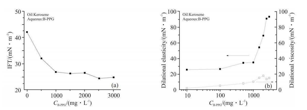B-PPG是部分支化、部分交聯的聚丙烯酰胺,其分子結構中既含有親水基團丙烯酰胺,又含有疏水的烷基鏈,是一種高分子量的界麵活性物質,能夠在油水界麵上自發地吸附成膜,降低界麵張力。Fig.2為B-PPG濃度對煤油-水界麵張力和界麵擴張流變參數的影響。由Fig.2(a)可知,B-PPG溶液具有一定的界麵活性,隨著其濃度增大,界麵張力逐漸降低,濃度高於1000mg/L後,達到平台值,約為25為mN/m。由Fig.2(b)可以看出,濃度低於1000mg/L時,B-PPG形成的界麵膜強度較低,擴張彈性和擴張黏性隨濃度緩慢增大。擴張彈性從約25mN/m升高到35mN/m,擴張黏性從約1mN/m升高到10mN/m;當B-PPG濃度大於1000mg/L時,隨著濃度的增大,界麵膜的擴張彈性顯著升高,濃度達到2000mg/L時,擴張彈性高達90mN/m;而擴張黏性變化不大,僅上升到約20mN/m。