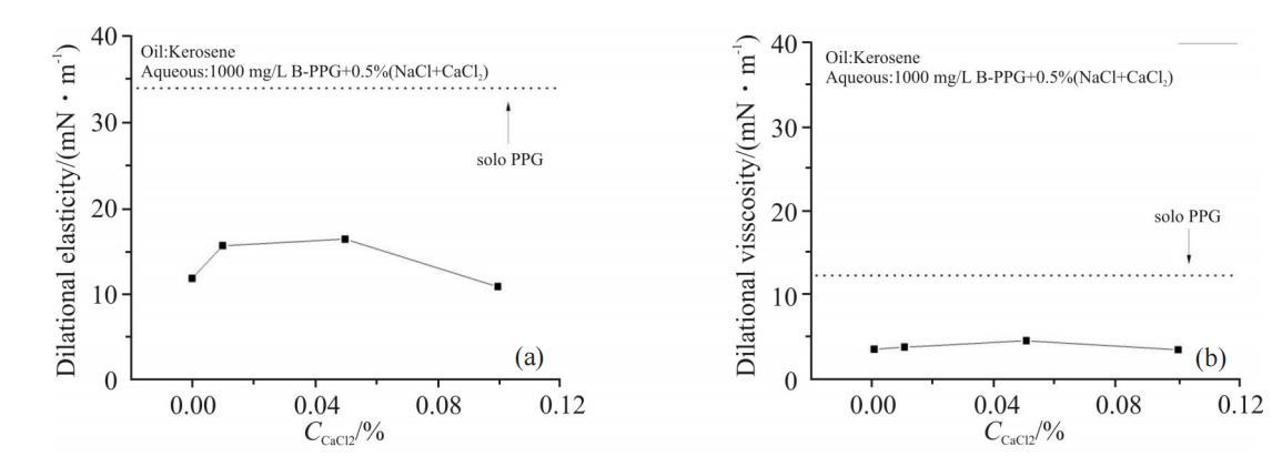 Ca2+濃度對1000mg/LB-PPG溶液界麵擴張參數的影響見Fig.7。從圖中可以看出,電解質中Ca2+含量增大對界麵擴張黏性的影響較小;而擴張彈性則在低Ca2+濃度條件下略有變化,從12mN/m增大到17mN/m。二價陽離子能夠與2個負電荷發生靜電吸引作用,因此,可作為“橋梁”,與不同B-PPG分子中的負電荷發生作用,增加聚集體結構的強度。Ca2+比Mg2+半徑大,與不同B-PPG分子發生作用的幾率也大,增大擴張彈性的幅度較大。
