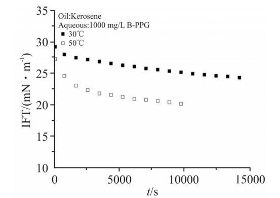 在油田開采過程中,油藏溫度是必須考慮的要素之一。對於分子結構中含聚氧乙烯基團(EO)的表麵活性劑,溫度升高會破壞EO與水分子形成的氫鍵,增大表麵活性劑的油溶性,對界麵張力的影響較大。而對於離子型表麵活性劑,溫度對界麵張力的影響較小。Fig.8示出了1000mg/L B-PPG溶液在30℃和50℃時的動態界麵張力。由圖可見,在50℃時,體係的界麵張力比30℃時降低了5mN/m左右。B-PPG的水溶性很大程度來源於酰胺基團與水分子形成的氫鍵,因此,溫度升高,B-PPG的油溶性增大,界麵吸附量有所增加,界麵張力明顯降低。