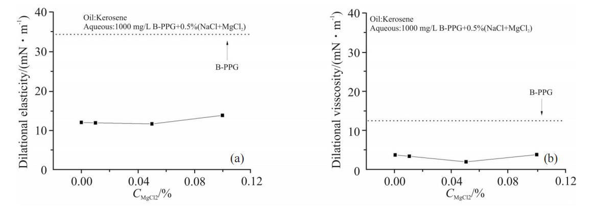 Mg g^{2+}濃度對1000 mg/L B-PPG溶液界麵擴張參數的影響見Fig.6。從圖中可以看出,電解質中Mg{}^{2+}含量增大對界麵擴張彈性和黏性的影響都較小,彈性從12mN/m增大到14mN/m。這說明盡管Mg2+可能會造成界麵膜排列的變化,但對B-PPG形成的聚集體結構影響不大。
