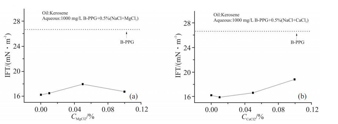 油藏地層水中含有Ca2+,Mg2+等二價陽離子,作為反離子可與B-PPG吸附膜發生作用,可能有其獨特的行為。固定水相總礦化度為0.5%,改變其中二價陽離子的含量,考察了Ca2+和Mg2+對B-PPG界麵膜性質的影響。Fig.5所示為二價陽離子濃度對1000mg/LB-PPG溶液界麵張力的影響。從圖中可以看出,隨著電解質中二價陽離子濃度增大,界麵張力均略有升高,其中Ca2+的影響程度略高於Mg2+。從陽離子半徑考慮,Ca2+>Mg2+>Na+,因此,用二價陽離子部分頂替一價陽離子,可能造成界麵分子排列的緊密程度有所降低,界麵張力略有升高。Ca2+的半徑更大,界麵張力的升高趨勢更明顯。