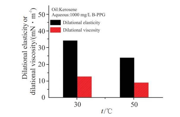 溫度對1000 mg/L B-PPG溶液界麵擴張彈性和黏性的影響見Fig.9。實驗結果表明,當溫度從30℃升高到50℃時,界麵擴張彈性和黏性均明顯降低。隨著溫度升高,界麵膜變得疏鬆,同時,B-PPG分子的熱運動加劇,擴散交換過程變快,上述變化均會造成界麵膜強度的降低,50℃時B-PPG界麵膜的彈性和黏性不到30℃的1/2。