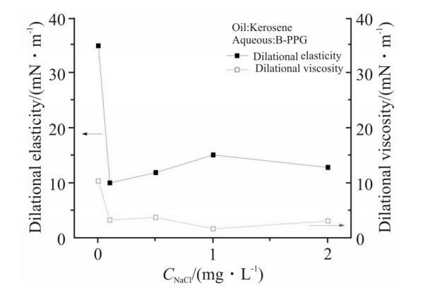 Fig.4為NaCl濃度對1000mg/L的B-PPG溶液界麵擴張參數的影響。由圖可知,加入NaCl後,體係的界麵擴張彈性和擴張黏性都明顯下降,擴張彈性降低超過了20mN/m,擴張黏性也由10mN/m左右下降到了5mN/m左右。