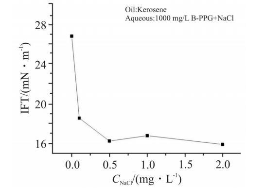 礦化度是影響化學驅配方效果的關鍵因素之一。B-PPG分子中的酰胺基團在水中可部分水解產生負電荷,因此,其界麵性能也會受到礦化度的影響。1000mg/L既是B-PPG的CAC,也是現場配方的使用濃度,因此,在此濃度下考察了礦化度對B-PPG界麵膜性質的影響。不同濃度的NaCl對1000 mg/L B-PPG界麵張力的影響見Fig.3。可以看出,NaCl的加入可以明顯降低B-PPG體係的界麵張力。隨著NaCl濃度的增加,界麵張力下降程度放緩;當NaCl濃度高於0.5%時,界麵張力不再變化。這是電解質壓縮B-PPG界麵膜的雙電層,減弱了靜電斥力,從而增大了B-PPG的吸附量造成的。