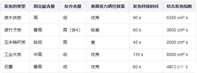 從數據可見,廢木塊炭和工業木炭因固定碳高、灰分低,表麵張力調控能力優秀,發泡持續時間長,綜合性能突出。廢竹子炭雖固定碳最高,但灰分中高鉀元素導致表麵張力變化過快,泡沫穩定性下降。