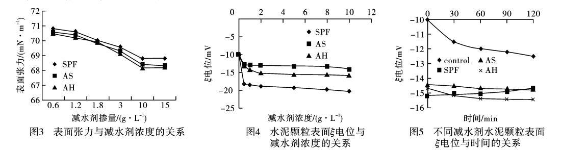 1)SPF對水泥顆粒表麵電位的影響ξ電位表示水泥顆粒間靜電排斥力的大小。ξ電位越大水泥顆粒間的靜電斥力越大,減水劑分散作用越強。摻加不同濃度SPF、AS和AH的水泥懸浮體係的ξ電位,如圖4所示。