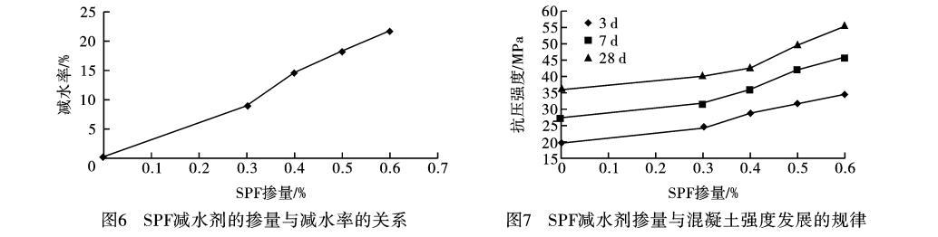c.SPF高效減水劑應用性能研究表明,隨著摻量的增大,減水率有成比例增加的趨勢,低摻量下即具有較強的減水分散效果,繼續增加摻量後減水率處於平緩狀態。摻加SPF高效減水劑對混凝土有明顯的增強作用,隨著減水劑摻量的增加,不同齡期的抗壓強度都在增加,同時混凝土早期強度發展很快,3d的強度可達到28d強度的60%—70%,7d強度可達到28d強度的80%—90%,混凝土後期強度也有增長的趨勢。
