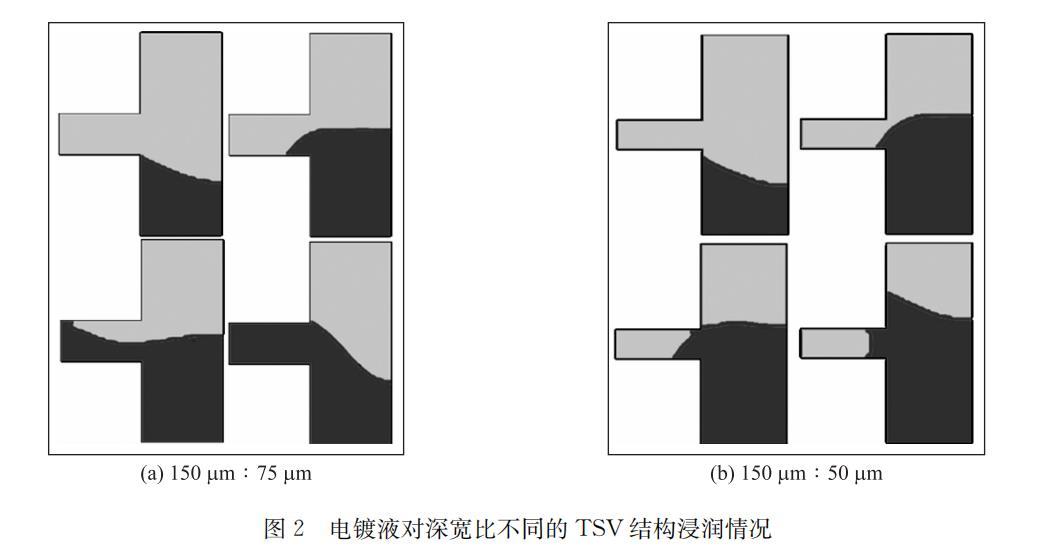 深寬比為150μm:75μm和150μm:50μm的TSV浸潤仿真結果分別如圖2的(a)(b)所示,前者可以完全浸潤,後者在TSV底部形成氣泡。模擬結果表明如果不進行充分潤濕,深寬比大於2:1的TSV就會因不能完整浸潤而在靠近TSV底部的位置形成部分表麵緊貼TSV側壁的大氣泡,且該氣泡在之後的電鍍過程中難以排出,導致電鍍液無法接觸到TSV底部附近的位置,進而形成較大空洞。