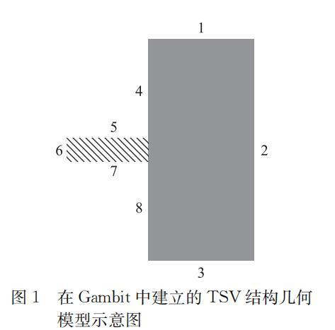 按照實際電鍍液及樣片的情況,在流體仿真軟件中進行建模。主要分為2個部分:前處理軟件Gambit中對平麵模型的建立,Fluent中對流場進行具體解算。本文截取TSV軸對稱結構的中心軸截麵,建立二維分析模型,直接反應實際TSV的浸潤過程。同時,基於對比實驗考慮,忽略電鍍液組分與被浸潤表麵化學反應造成的界麵影響,並直接采用與電鍍液物理性質基本相同的水作為液相組分。氣相組分中采用理想不可壓氣體假設模擬正常大氣壓下的操作環境。建立的Fluent分析模型如圖1所示。其中較小的矩形塊代表TSV,4~8代表被潤濕表麵。初始情況下,所有被模擬區域為氣相區域,之後液相從邊界3以特定流速進入(除流速討論單元,其餘均設置為0.05 m/s),逐步潤濕全部或局部表麵,直至從邊界1流出。具體設置為邊界1為壓力出口,2為對稱邊界,3為速度人口,4、5、6、7、8均為壁麵邊界條件。表麵張力和接觸角均采用實際測量值0.06 N/m,64°;重力加速度為9.81 m/s²,方向為豎直向下。